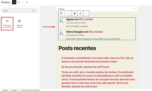 Basta acessar Aparência » Widgets e adicionar o widget “Comentários recentes” a uma barra lateral.