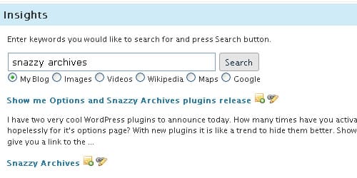 Insights é uma ferramenta poderosa para ajudar a escrever seus posts. Aumenta a produtividade e a qualidade de suas postagens usando a interface AJAX dinâmica. Esta interface carregar as informações relevantes para o seu post em segundos. Insights executa as seguintes funções: Permite que você encontre e link posts relevantes do seu blog em segundos sem precisar sair da do editor HTML, Inserir imagens do Flickr, Inserir videos do Youtube, pesquisar no Wikipedia, pesquisar no Google, inserir um mapa do Google e muito mais.