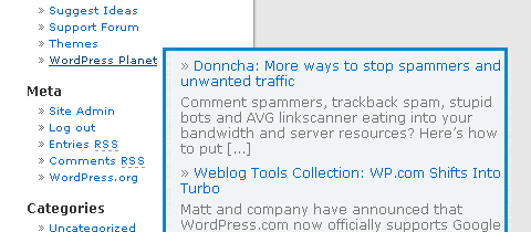 Live Blogroll fará seu blogroll ficar mais animado. Ele irá mostrar um número de ‘posts recentes' para cada link em seu Blogroll usando Ajax. Quando o usuário passa o mouse sobre o link, o feed RSS do site é automaticamente apresentado e um número de posts recentes é mostrado dinamicamente em uma caixa. O Live Blogroll usa cache interno para detecção de feeds e armazenamento em cache do WordPress para RSS feeds e garantir que você não tenha problemas de desempenho. O plugin é totalmente personalizável com CSS, e a posição é editável nas opções.