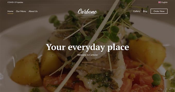 Carbone é um elegante tema WordPress para restaurante. Possui um fundo de vídeo na página inicial para chamar a atenção dos visitantes. Você pode criar facilmente uma página de destino para o menu do seu restaurante e adicionar todos os itens alimentares com imagens lindamente.