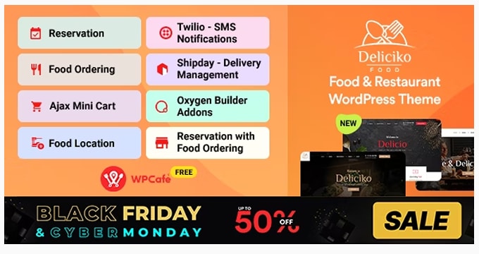 Deliciko é um tema WordPress de restaurante criativo, moderno e profissional. O tema é perfeito para sites de restaurantes, fast food, restaurantes de frutos do mar, receitas, padarias, hambúrgueres, cafeterias e pizzarias. O tema também oferece suporte a reservas de restaurantes e estilo de menu de comida com o plug-in WPCafe.