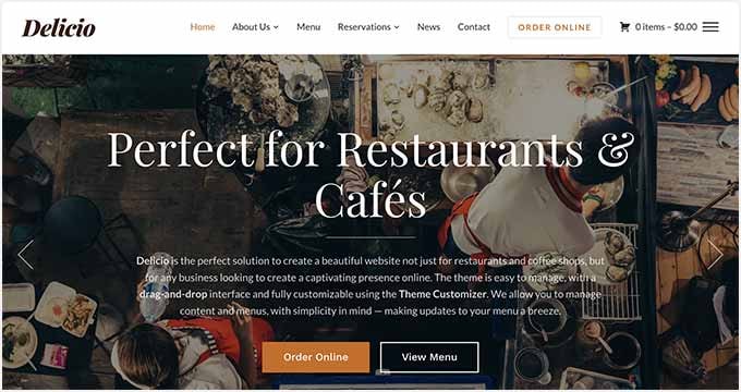 Delicio é um tema WordPress premium para restaurantes, cafés e bistrôs. Ele vem com um menu, seções de localização e muito mais. É compatível com plugins de formulário de reserva de restaurante, permitindo que você aceite reservas on-line em seu site.