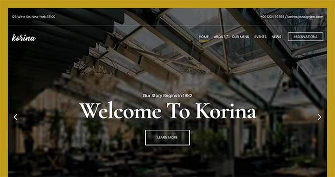 Korina é um tema WordPress elegantemente projetado para restaurantes, bares , cafés e outros sites relacionados a comida. Possui uma página de menu de restaurante com widget que é fácil de configurar e atualizar sem escrever nenhum código.