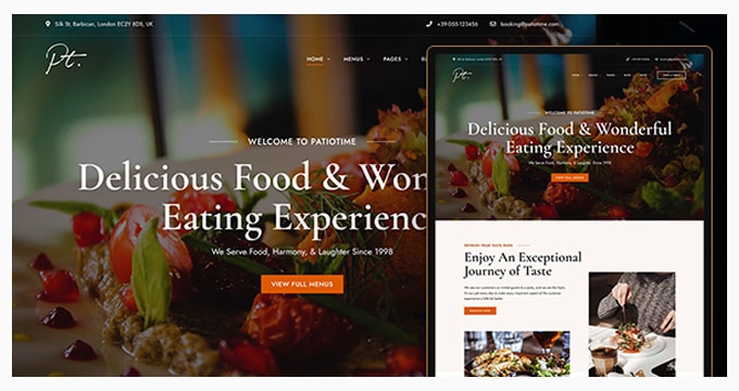 PatioTime é outro tema WordPress profissional para restaurantes. Este é um tema WordPress moderno e elegante projetado para pequenos restaurantes, cafés, bares e qualquer outro site de negócios relacionado a alimentos. Usamos tecnologia moderna de desenvolvimento web, acompanhamos as últimas tendências de design, para criar sites de restaurantes que estejam de acordo com o bom gosto contemporâneo, para que você possa apresentar todos os aspectos do seu negócio de restaurante, atrair e conectar-se a mais clientes e criar uma rede on-line de sucesso negócios.