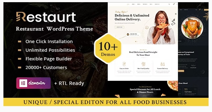 Restaurt é um tema WordPress multifuncional de aparência legal, adequado para restaurantes e outros sites relacionados a restaurantes. Mais de 10 demos, mais de 40 elementos exclusivos, opções de tema intuitivas, mais de 10 cabeçalhos e design exclusivo garantem que você tenha tudo ao seu alcance. E também não requer habilidades de codificação, pois usa um poderoso construtor de páginas de arrastar e soltar Elementor . Crie o site exclusivo e moderno que você deseja e aumente seu negócio de restaurantes.