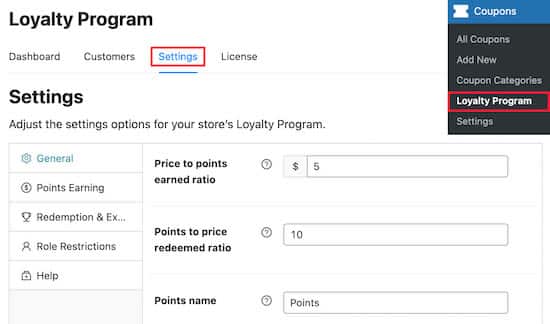 Depois de fazer isso, você precisa acessar Coupons » Loyalty Program no painel de administração do WordPress e clicar na opção de menu “Settings”.