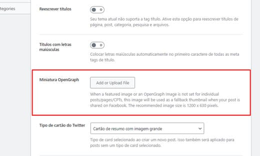 Em seguida, clique na guia Metadados globais e ao rolar a página para baixo você vera a seção Miniatura OpenGraph. Você pode clicar no botão “Add or Upload File” para escolher uma imagem padrão do Facebook Open Graph se um artigo ou página não tiver uma imagem Open Graph definida individualmente.