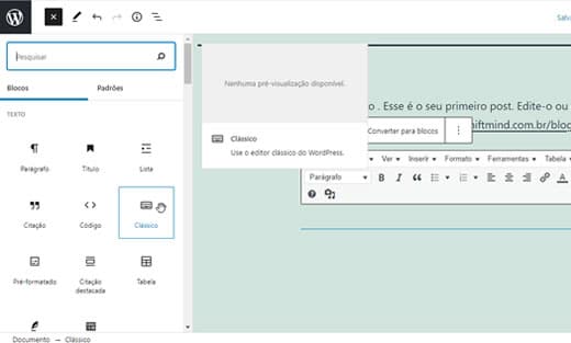 Após a ativação do Advanced Editor Tools, você poderá utilizar o bloco “Clássico” que permitirá que você utilize os recursos do Editor Clássico dentro do Editor Gutenberg: