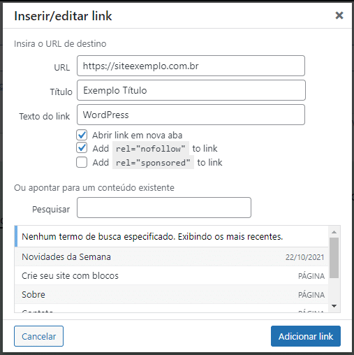 Através do bloco Clássico, clique no botão inserir link no editor de post. O pop-up de inserir link aparecerá e você notará o campo Título restaurado e uma caixa de seleção para adicionar o atributo nofollow ao link.