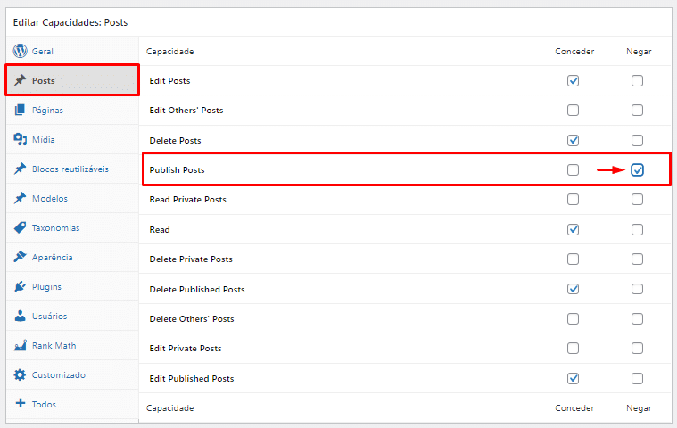 Por exemplo, se você quiser impedir que a função de usuário Autor publique posts de blog, será necessário alternar para a seção Posts e marcar a caixa Negar ao lado da opção “Publish Posts”.