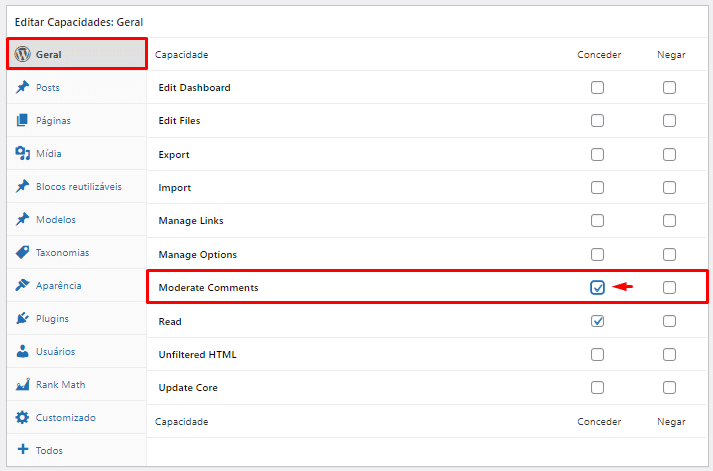 Para fazer isso, você precisa ir para a seção “Geral” e marcar a caixa Conceder ao lado da opção “Moderate Comments”.