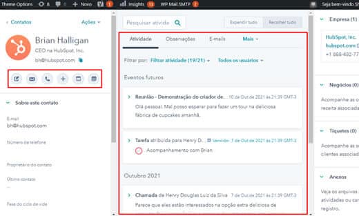 A partir daqui, você pode atribuir o contato a um membro da equipe, enviar e rastrear e-mails, criar tarefas, agendar reuniões e ligações e muito mais.
