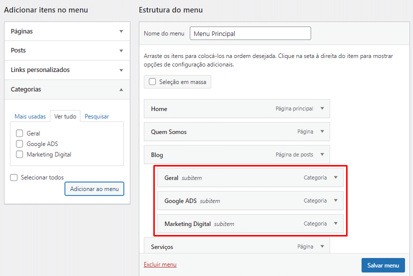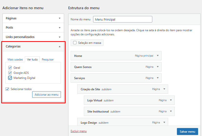 Basta selecionar as categorias que deseja adicionar ao menu e clicar no botão “Adicionar ao menu”.