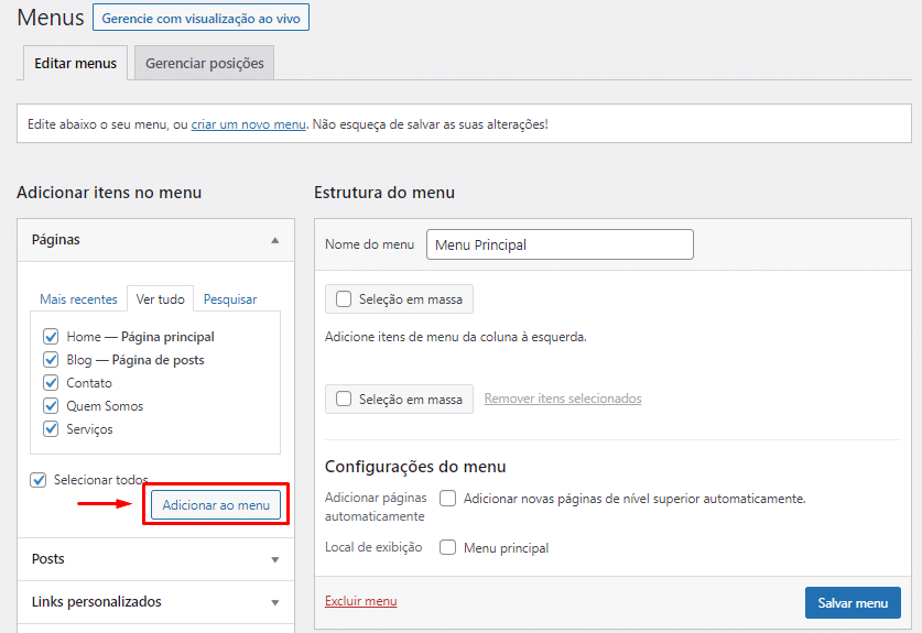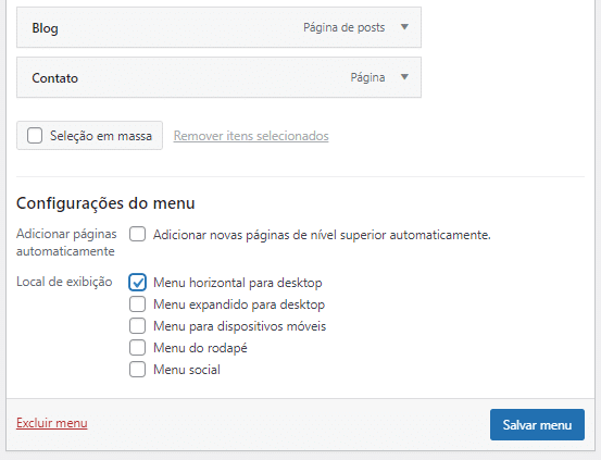 Após adicionar páginas ao menu, selecione o local onde deseja exibir o menu e clique no botão “Salvar menu”.