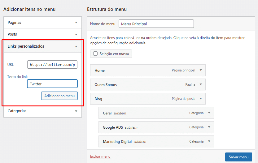 Além de categorias e páginas, o WordPress também torna super fácil adicionar links personalizados ao seu menu. Você pode usá-lo para vincular seus perfis de mídia social, sua loja online e/ou outros sites de sua propriedade.