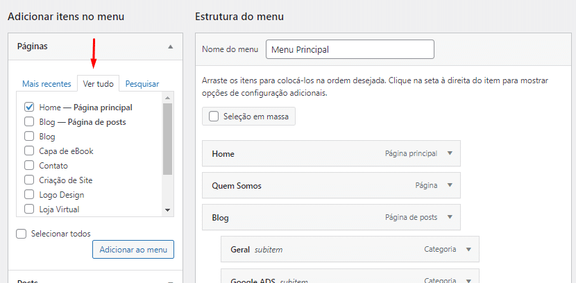 Para adicionar sua página inicial a um menu de navegação, você precisará clicar na guia “Ver tudo” em Páginas. A partir daí, você deve ver sua página inicial.