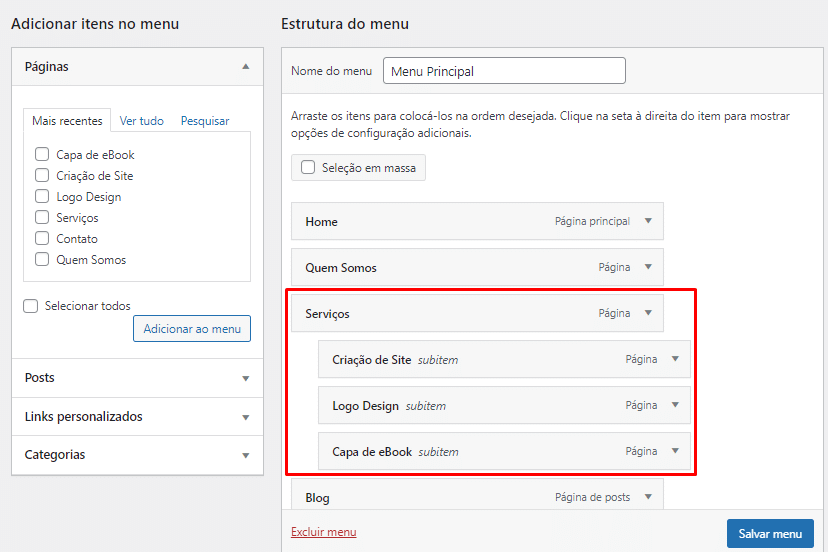 Para criar um submenu, arraste um item abaixo do item pai e arraste-o levemente para a direita. Fizemos isso com 3 subitens abaixo de “Serviços” em nosso menu: