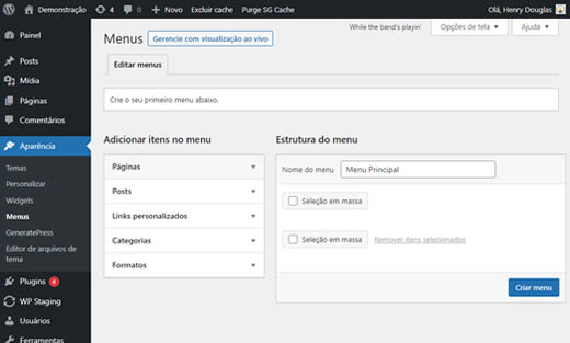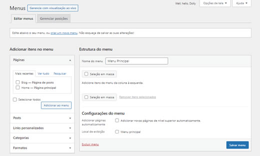 O WordPress torna muito fácil adicionar menus e submenus. Você pode adicionar links para suas páginas, categorias ou tags mais importantes, posts de blog e até links personalizados, com seu perfil de mídia social.