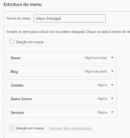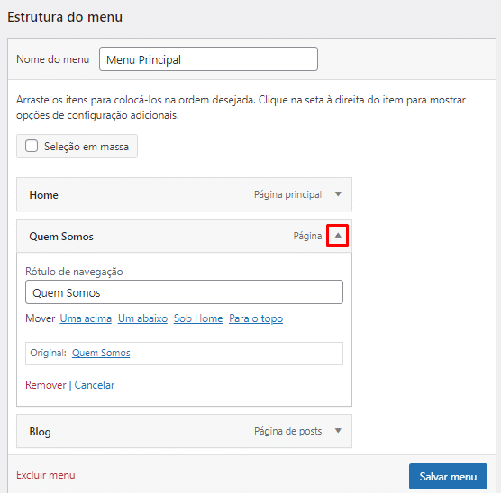 Qualquer item de menu pode ser editado clicando na seta para baixo ao lado dele.