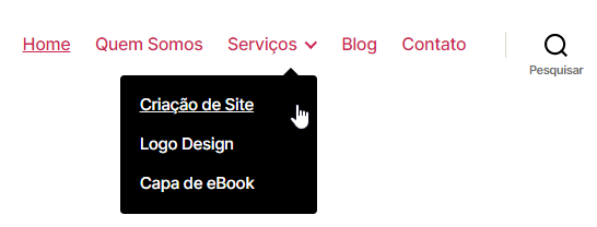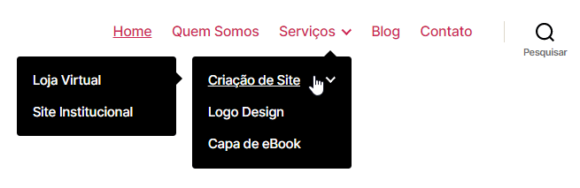 Neste exemplo, você pode ver que “Criação de Site” (um item filho de “Serviços”) possui dois itens filhos próprios.