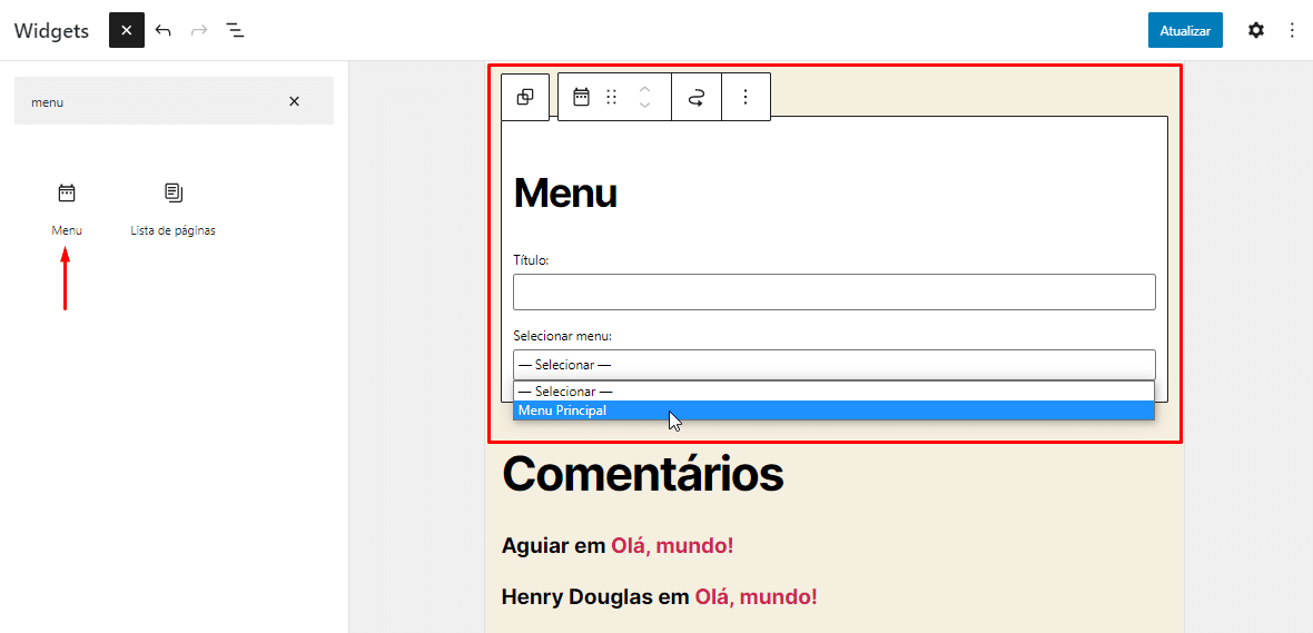Basta acessar Aparência » Widgets e adicionar o widget “Menu” à sua barra lateral. Em seguida, adicione um título para o widget e escolha o menu correto na lista suspensa “Selecionar menu”.