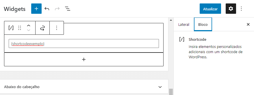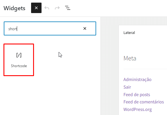 Basta visitar a página Aparência » Widgets e adicionar um bloco de widget “Shortcode” a uma barra lateral.