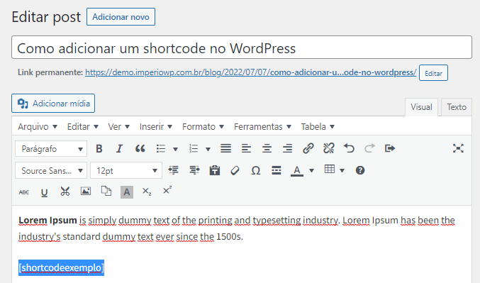 Adicionando um shortcode no antigo editor clássico do WordPress