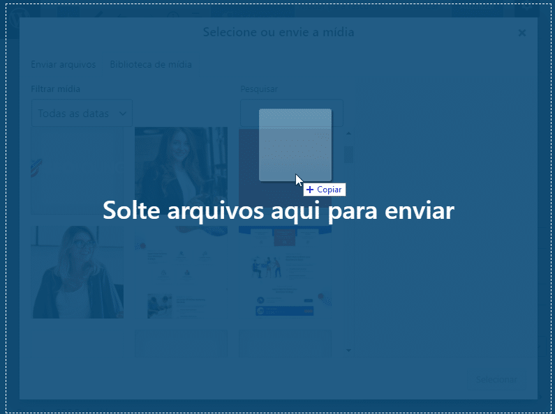 Você será levado para a biblioteca de mídia do WordPress. Se você ainda não adicionou o PDF, faça isso agora. Basta arrastar o arquivo para a biblioteca e, quando ver a mensagem “Solte arquivos aqui para enviar”, você poderá soltar o botão do mouse.