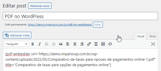 O PDF Embedder adicionará um shortcode no seu post ou página. Vai parecer [pdf-embedder url="PDF-URL"]. Isso exibirá o PDF quando você visualizar ou publicar o arquivo.