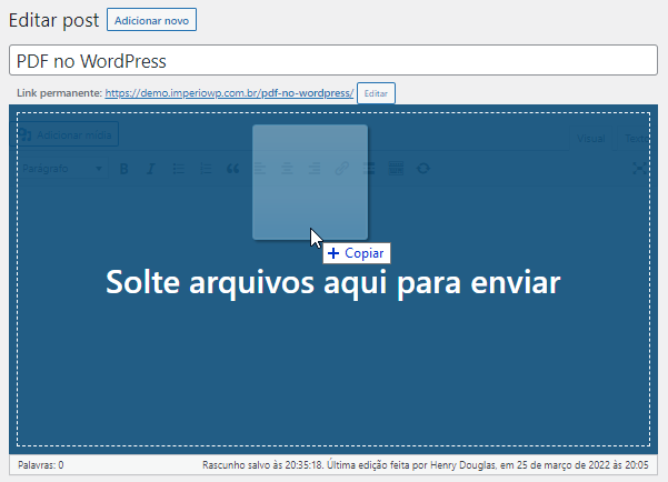 Depois disso, você deve colocar o cursor onde deseja exibir o PDF e, em seguida, arrastar o PDF para a página. Ao ver a mensagem “Solte arquivos aqui para enviar”, você pode soltar o botão do mouse.