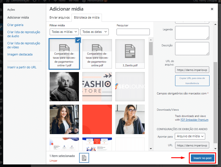 O PDF será carregado automaticamente para sua biblioteca de mídia e selecionado. Tudo que você precisa fazer agora é clicar no botão “Inserir no post”.