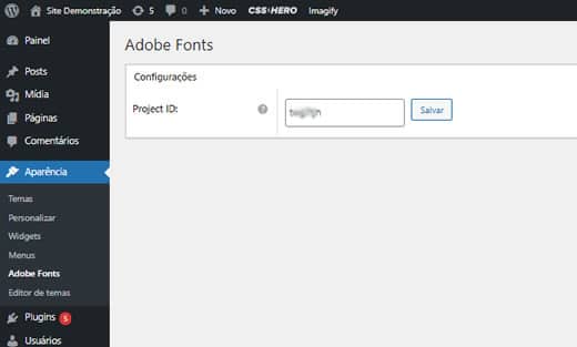 Com a ID do projeto em mãos, você pode visitar Aparência » Adobe Fonts para inserir a ID do Projeto no campo “Project ID” e clicar no botão “Salvar”: