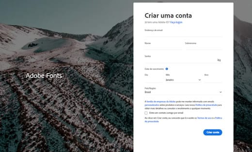 Primeiro você precisa criar uma conta Adobe Fonts. Para fazer isso, visite https://fonts.adobe.com/ para criar uma conta.