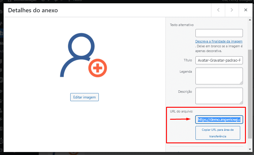 Após o upload da imagem, você precisa clicar sobre a imagem e copiar a URL do avatar ao lado da imagem.