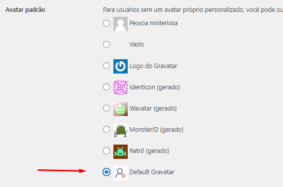 Você notará que existem algumas opções disponíveis na opção de avatar padrão. Esses avatares são usados ​​quando um usuário não possui um gravatar associado ao seu endereço de e-mail.