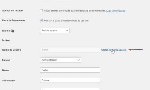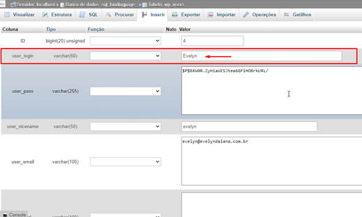 Altere o valor user_login para o que quiser. Por exemplo, você pode substituir o nome de usuario “Evelyn” por “Fabio”.