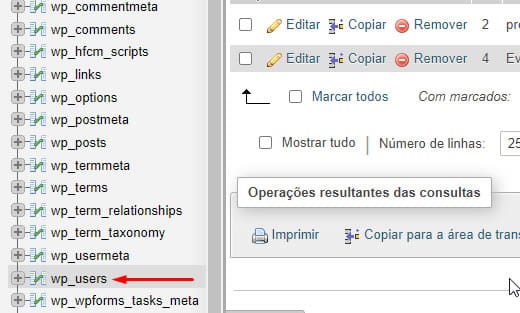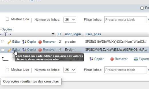 Clique na tabela wp_users do lado esquerdo. Em seguida, clique em editar no nome de usuário que deseja editar.