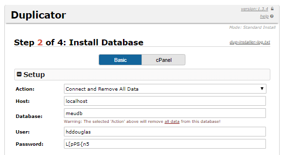 Na tela seguinte, o Duplicator solicitará que você insira as informações do banco de dados. Este é o banco de dados que você deseja usar para o seu novo site WordPress clonado.