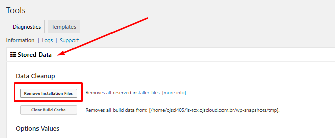 Em seu site WordPress clonado, vá para a página Duplicator » Tools e clique para expandir a seção “Stored Data” e clique no botão “Remove Installation Files”.