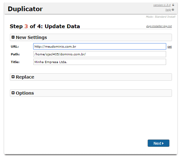 Duplicator agora importará seu banco de dados e arquivos. Em seguida, ele solicitará que você atualize as configurações do novo site.