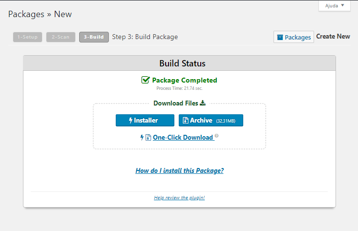 Depois que o Duplicator terminar o processo de backup, você verá um link para baixar o arquivo que contém arquivos de backup e um script de instalação.