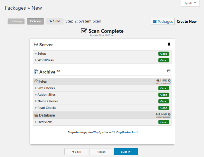 Se tudo estiver marcado como “Good”, então você pode ir em frente e clicar no botão “Build” para continuar. O Duplicator irá agora fazer backup de seu banco de dados, imagens, temas, plugins e todos os outros arquivos do WordPress em um único pacote para download.