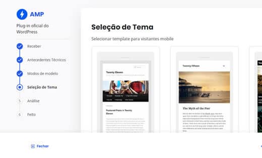 O assistente permite que você inclusive escolha um tema para a versão amp do seu site: