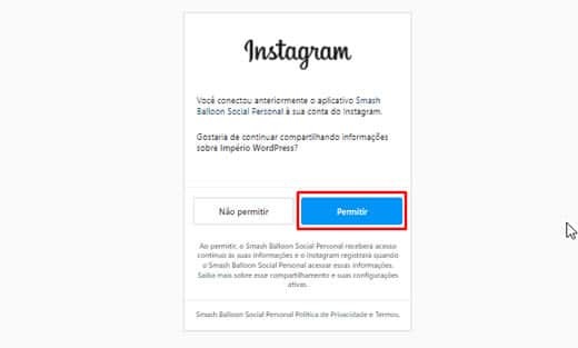 Na próxima tela clique no botão permitir para conectar sua conta nas configurações do plugin Smash Balloon Instagram Feed.