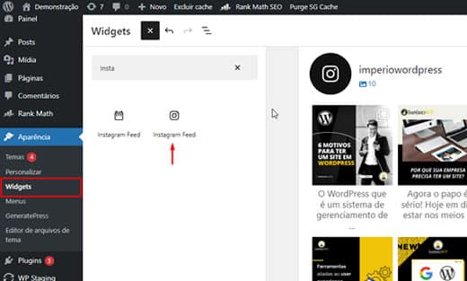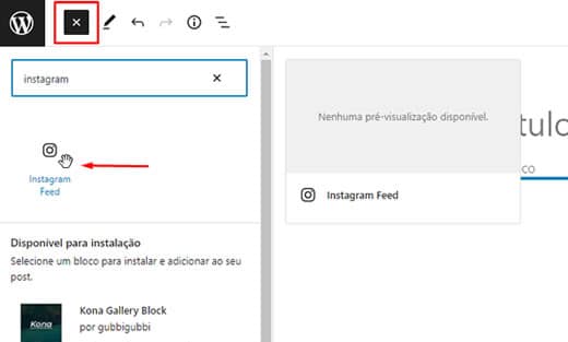 Clique no símbolo (+) para adicionar um novo bloco e selecione o bloco “Instagram Feed” na seção Widgets: