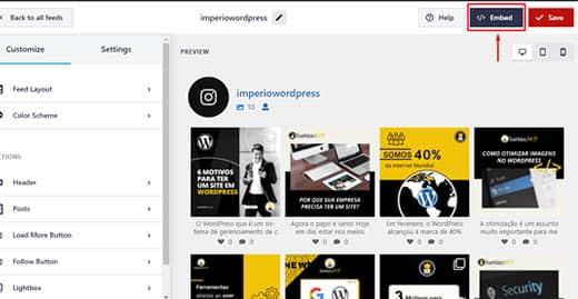 Na próxima tela aparece opções de personalização de como os posts do Instagram irão aparecer no seu site WordPress. Personalizaremos o feed do Instagram mais para frente neste post. No momento apenas clique no botão “Save” para salvar o seu feed, em seguida clique no botão “</> Embed” para você copiar shortcode.