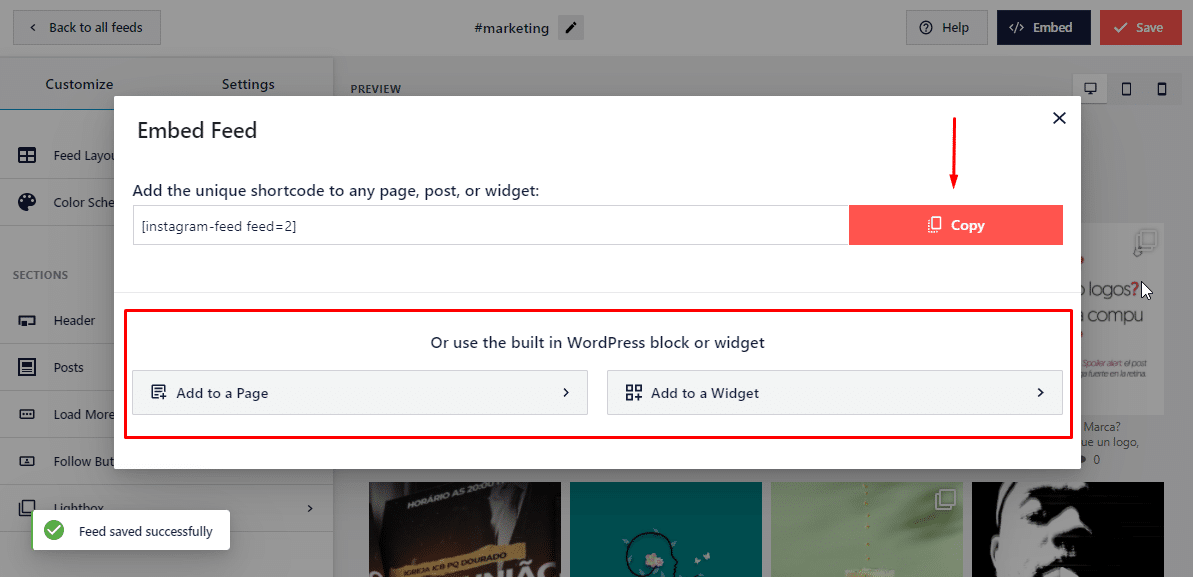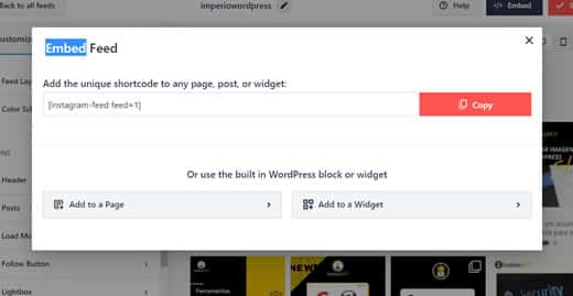 Este é o shortcode que você irá utilizar para inserir o feed do Instagram nos posts, páginas e widgets do seu site, clique no botão “Copy”:
