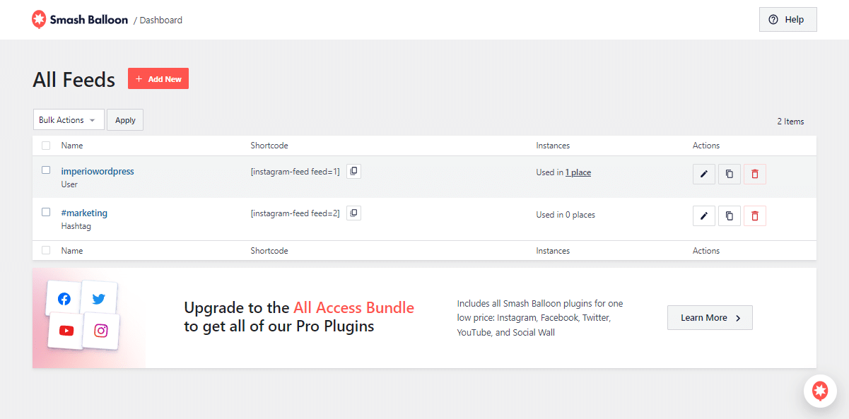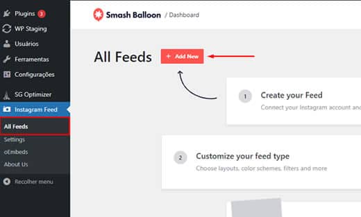 Primeiro, vá para Instagram Feed » All Feeds e » Add New e você poderá adicionar vários tipos de feeds diferentes com apenas alguns cliques.