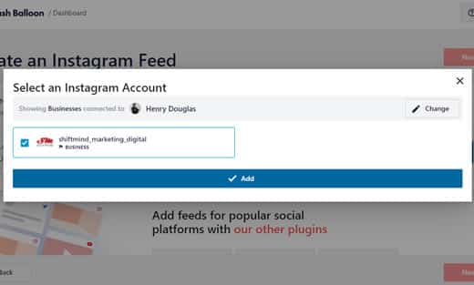 Com a permissões concedidas você será direcionado a área de administração do plugin Smash Balloon onde você poderá visualizar e selecionar sua conta empresarial do Instagram, clique no botão “Add” para adicionar sua conta: