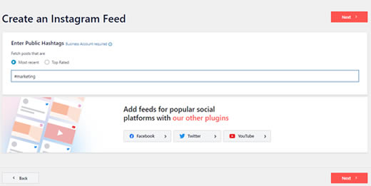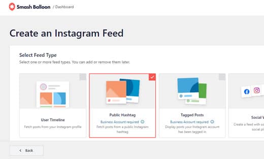 Você pode alterar o tipo de feed em Instagram Feed » All Feeds » Add New para um feed de hashtag. Na próxima tela você terá que escolher o tipo de feed, escolha a opção Public Hashtag: